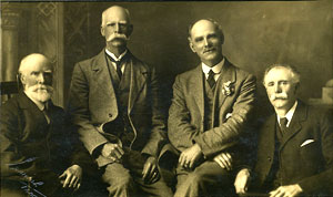 Left to right: Uncle John (72), my great grandfather Daniel (68), Uncle Bob (61) and Uncle Allen (60). You can find them years younger in the group photograph. They have added up their ages for an Aggragate age of 261. |