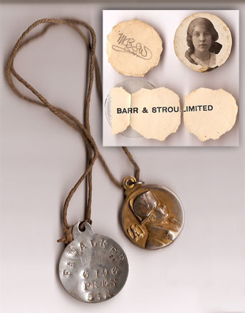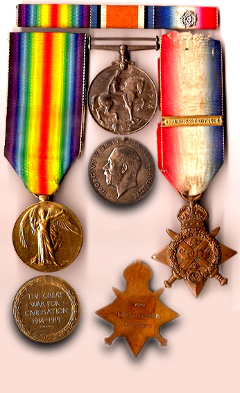 This is my grandfather's dog-tag and the locket (with Napoleon on the front) that contained a photograph of his then fiancée (not my grandmother). He had torn up pieces of company notepaper to stop the picture shifting in the locket. He worked for Barr & Stroud in Glasgow. He would also have worn a cardboard dog-tag and had he been killed, the metal tag would have been kept with his body, often placed in the mouth, to help identification. The cardboard one would have been retained by his regiment. PRES means he was a Presbyterian. Below are his Great War medals: The Victory Medal 1914-1919 (left), The British War Medal 1914-1920 and the 1914 Star, sometimes (erroneously) known as the Mons Star. On 19 October 1919 it was announced that The King had approved the issue of a clasp (seen on the right-hand ribbon) to those already awarded the 1914 Star 'who actually served under the fire of the enemy in France or Belgium' between 5 August and 22 November 1914.