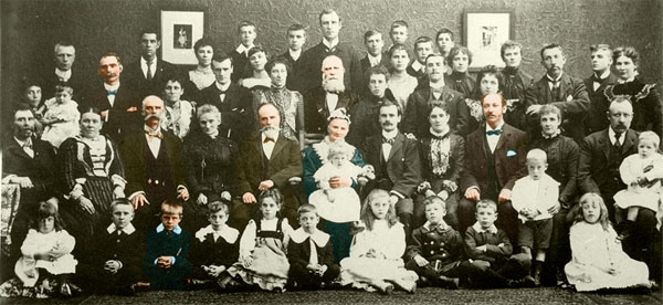 The other hand-tinted men of a similar age are his brothers. The patriarch in the centre is my great-great grandfather, Allan, in front of him my great-great grandmother, Helen. |