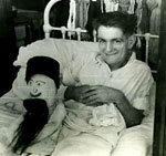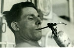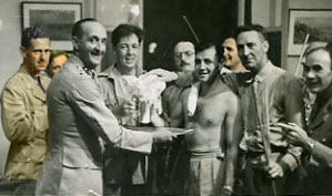 Guest Night at 63 - Summer 1942 My father (tinted, far left) photographed during a drunken evening in the company of two men destined to become legends in the medical world: John Charnley (tinted, peering up from beside my father) who became a poineer in hip replacement surgery; and Richard Doll (tinted, right) who first confirmed the link between smoking and lung cancer. |