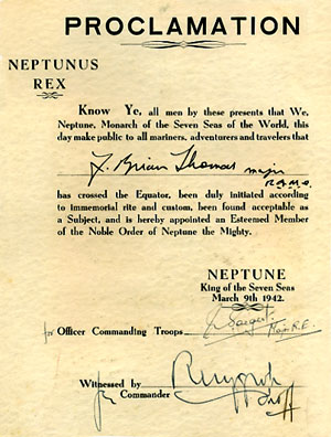 February to April 1942 The convoy embarked from Gourrock in Scotland and sailed through the North Atlantic to Freetown in Sierra Leone. On 9 March 1942 my father crossed the Equator for the first time (see left) before rounding the Cape of Good Hope and heading up towards Durban. He eventually disembarked at Port Tewfik, the major war-time port of Egypt and for south-about convoys to and from the UK. |