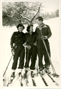 Captioned First Snow, Dec. 1945 It is Brigsie this time who looks at the camera. My father was very thin because he had recently recovered from hepatitis which he contracted in the Middle East. He took the girls skiing, my mum fell and broke her wrist and as he treated her their romance blossomed. |